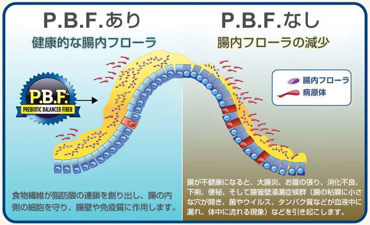 プレバイオティクスは一般的に、その多くが腸に届く前に弱ってしまいます。 そこでルーシーペットプロダクツは、独自の技術 「プレバイオティクス バランスファイバー(P.B.F.)」 によって複数のプロバイオティクスをブレンドしていますので、胃での消化に耐え確実に腸内フローラに栄養を届けることができ、 体全体の健康を促進させることが可能となっているのです。