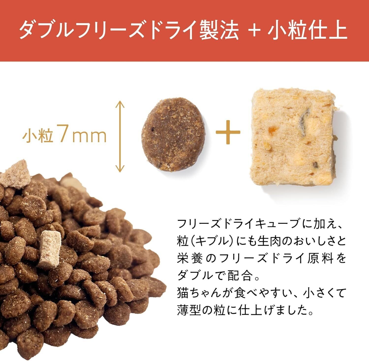 【ダブルフリーズドライ製法】フリーズドライ入りキブルとフリーズドライキューブをミックス。フリーズドライの素材そのままのおいしさを加えました。 1,フリーズドライを加えた高タンパクのキブル。 高タンパクで歯ごたえのあるキブルに、フリーズドライの素材そのままのおいしさをプラスしています。 2,素材のおいしさそのまま フリーズドライキューブ。 鶏肉に、栄養豊富なサツマイモ・カボチャ・タラ肝・緑イ貝・昆布をミックスしてフリーズドライ。おいしさをギュッと凝縮しました。
