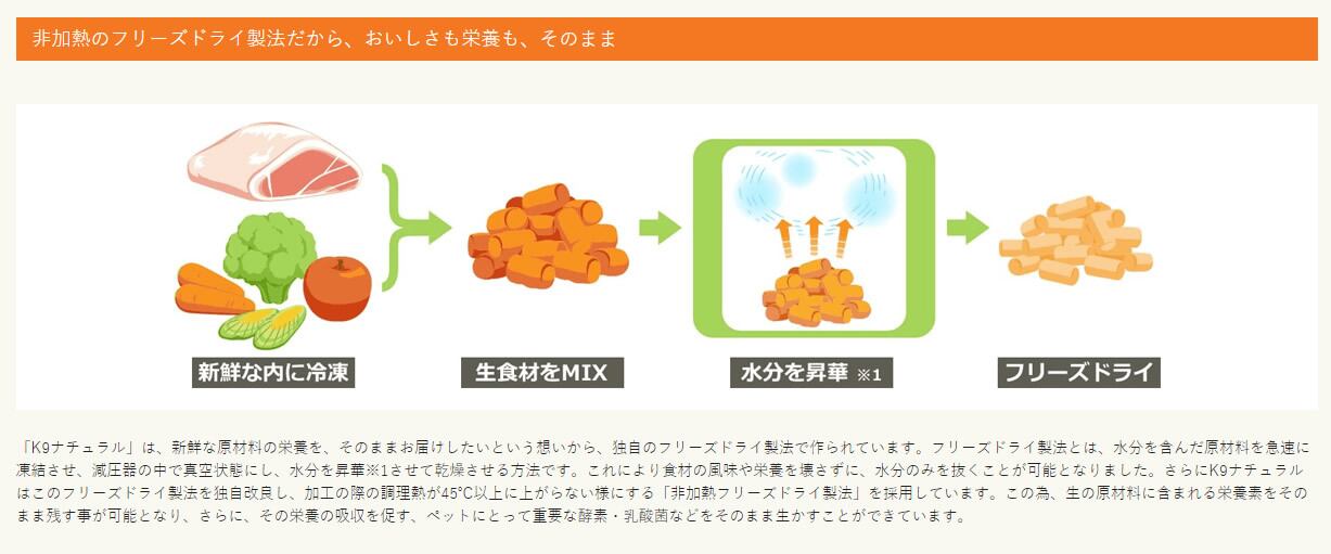 そのまま非加熱フリーズドライ加工しているので、肉の繊維や筋、鶏の骨や野菜・果物の一部など、そのまま出てくる可能性がございます。