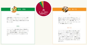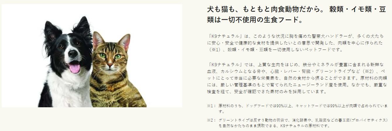また、肉食動物である犬や猫にとって不要な、穀類・イモ類・豆類などの、粘性の高いツナギや量増しとしての原材料を一切使用せず、