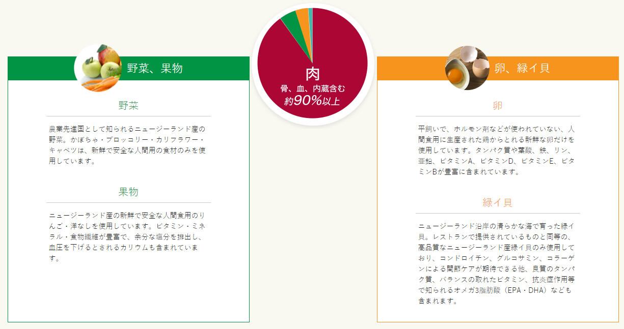 鶏肉(人間食用の家禽から生産される)、心臓(子羊)、腎臓(子羊)、肝臓(子羊)、血(子羊)、フラックスシードフレーク、ニュージーランド緑イ貝、乾燥昆布、タウリン、ビタミンE、酸化マグネシウム、プロティネイト亜鉛、プロティネイト銅、プロティネイトマンガン、ビタミンB1、ビタミンD3、葉酸